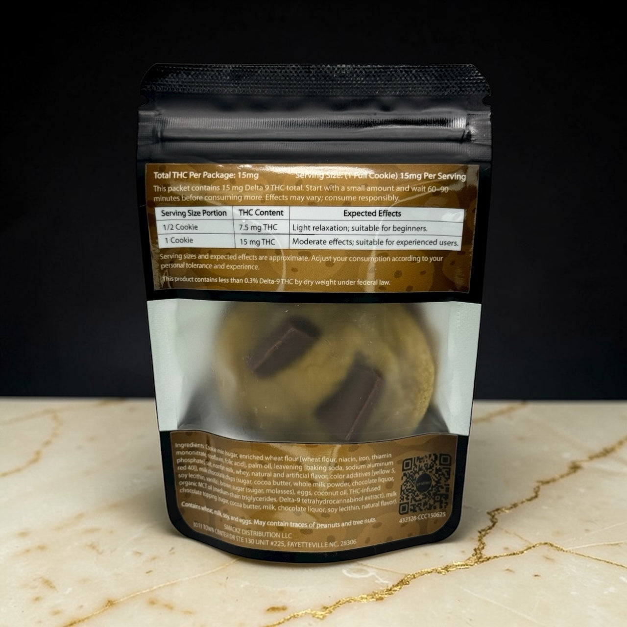 molasses), eggs, coconut oil, THC-infused MCT oil (medium-chain triglycerides, Delta-9 tetrahydrocannabinol extract), milk chocolate topping (sugar, cocoa butter, milk, chocolate liquor, soy lecithin, natural flavor).