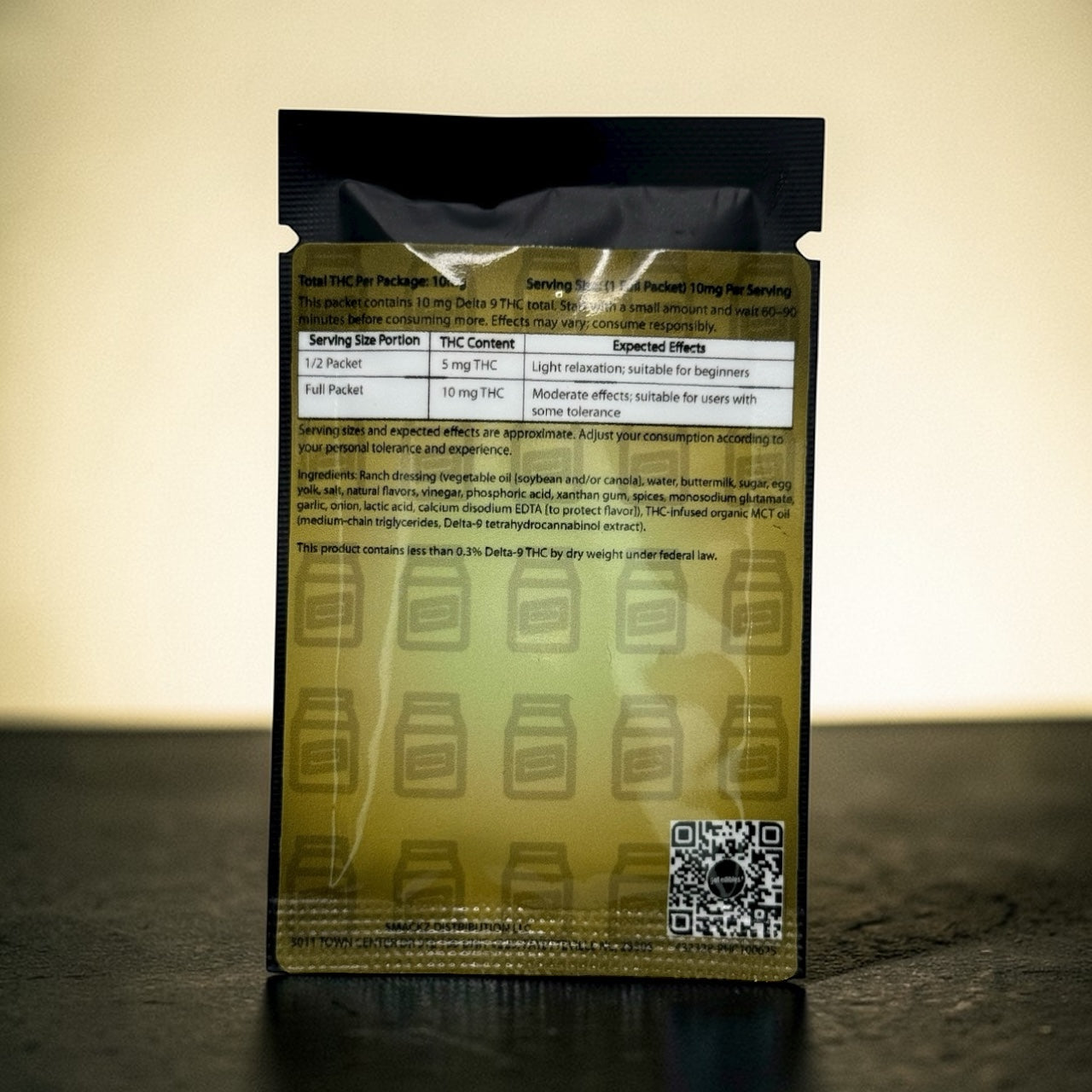 Ingredients: Ranch dressing (vegetable oil [soybean and/or canola], water, buttermilk, sugar, egg yolk, salt, natural flavors, vinegar, phosphoric acid, xanthan gum, spices, monosodium glutamate, garlic, onion, lactic acid, calcium disodium EDTA [to protect flavor]), THC infused MCT oil (medium-chain triglycerides, Delta-9 tetrahydrocannabinol extract).