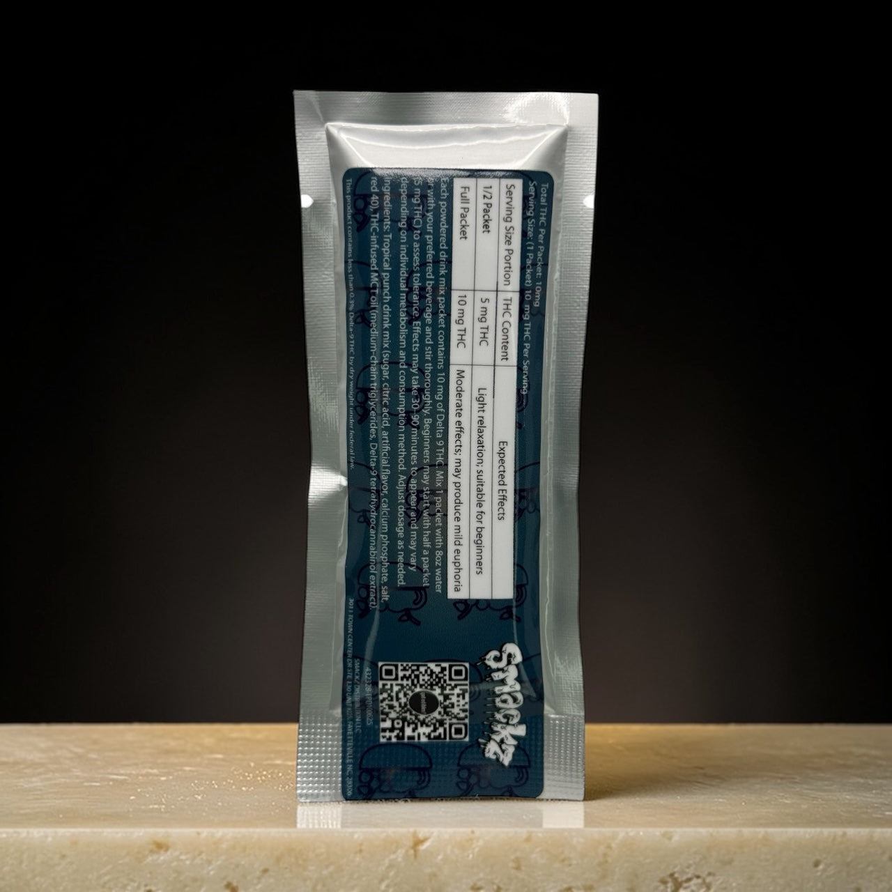Each powdered drink mix packet contains 10 mg of Delta 9 THC. Mix 1 packet with 8oz water or with your preferred beverage and stir thoroughly. Beginners may start with half a packet (5 mg THC) to assess tolerance. Effects may take 30–90 minutes to appear and may vary depending on individual metabolism and consumption method. Adjust dosage as needed.